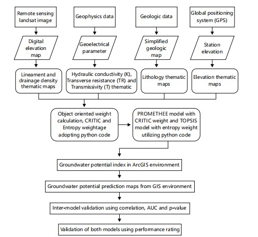 The study was conducted in several stages by integrating geology, geophysical data and remote sensing datasets. The first stage involves the collection of geophysical data using the electrical resistivity method (Vertical Electrical Sounding technique) and geological mapping for classifying the area to create a simplified geological map. A remote sensing dataset, including a Digital Elevation Model (DEM), was preprocessed to generate lineament density and drainage density maps, while elevation data was acquired via GPS. The acquired datasets were systematically processed and analyzed to delineate the groundwater potential across the study area. Spatial layers representing key controlling factors were generated and georeferenced within the ArcGIS environment to produce thematic maps essential for spatial modeling and multi-criteria evaluation. The thematic maps for these variables were generated in ArcGIS 10.8 utilizing the Inverse Distance Weighting (IDW) interpolation method. Subsequently, the CRITIC and Entropy weighting scheme, implemented in a Python environment, was employed to objectively quantify the relative importance of the selected criteria. The weighted parameters were then integrated using the PROMETHEE-II and TOPSIS ranking algorithm to compute a composite Groundwater Potential Index (GPI), facilitating a robust special prioritization of groundwater potential zones. This process culminated in the creation of a groundwater model map within a GIS environment for the study area. Figure 1, Flowchart of the methodology, illustrates the sequential steps of the study from data collection to analysis.