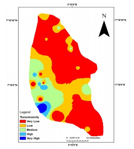 The influence of hydraulic conductivity on groundwater occurrence is well established, with higher K values typically associated with increased aquifer permeability and storage capacity. In this study, approximately 76% of the area is classified within medium to high hydraulic conductivity zones, indicating favourable conditions for groundwater movement and accumulation. The remaining 24% is characterized by low to relatively low K values, suggesting restricted groundwater flow potential. Although elevated K values are indicative of enhanced aquifer productivity, hydraulic conductivity alone may not be sufficient to fully assess the region’s groundwater potential. Its interpretation must be considered alongside other hydrogeophysical parameters such as transmissivity, aquifer thickness and structural features to obtain a comprehensive evaluation of groundwater resource viability.