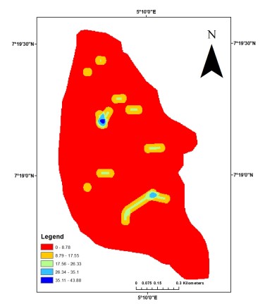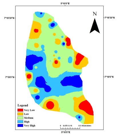 Elevation: The Global Positioning System (GPS) was used for the collection of elevation data. The GPS was tuned to WGS 1984, Minna, Nigeria, 31N datum. The data was saved and georeferenced in a GIS environment, creating the elevation map Fig. 3, which shows the steepness of the area, which serves as a pointer to the degree of runoff and infiltration.