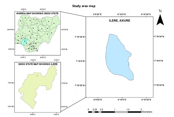 Location, site and accessibility: Ile here is situated in Ifedore local government area of Ondo State, in the Southwestern basement complex of Nigeria Fig. 2. The study area “Ilere” is located along Ijare road and data acquisition was between March and April, 2024. The geographic extent of the study area is defined using Universal Traverse Mercator (UTM) coordinates system, based on the Minna Datum (Zone 31N). Spatial boundaries span from Easting 738567 mE and 739035 mE and Northing 806719 mN and 812694 mN and Longitude 5°10’30’’E and 5°09’30’’E and Latitudes 7°19’30’’N and 7°18’30’’N. It is a well-built-up area and is accessible through major tarred roads, various untarred roads and footpaths.