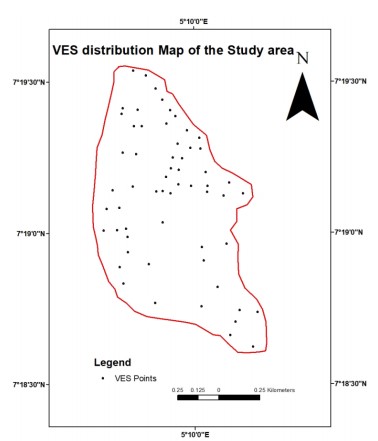 A total of fifty-nine VES stations were established across the study area to ensure adequate spatial coverage. Measurements of subsurface resistivity were obtained using the OHMEGA resistivity meter. Global Positioning System (GPS) receivers were used to georeferenced each VES location for subsequent spatial modeling and integration within a GIS environment. The layout of the VES stations is illustrated in Fig. 5.