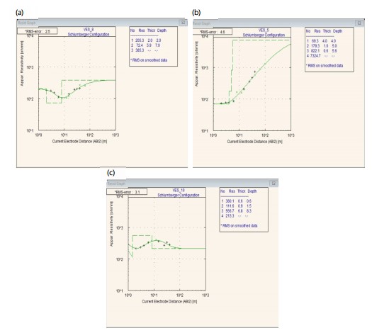 Field data were initially plotted as apparent resistivity versus half-current electrode separation (AB/2) on bi-logarithmic graph paper. Preliminary interpretations were performed through manual partial curve matching with standard master curves to generate smooth theoretical responses. Further refinement of the resistivity sounding curves was achieved using the 1D computer-based iterative inversion software. This enabled the derivation of geoelectrical parameters, including layer resistivity and thickness, which are essential for characterizing aquifer systems and delineating subsurface lithologic units. Representative VES curves from the study area are presented in Fig. 6(a-c), while a summary of the interpreted geoelectrical parameters is provided in Table 1.