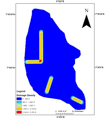 Lineament detection was conducted using the PCI Geomatica 2012 software, applying edge enhancement and directional filtering techniques to improve feature delineation. The resulting linear features were processed using kernel Density Estimation (KDE) to generate a continuous surface representing lineament density, as illustrated in Fig. 5. For drainage density analysis, the hydrological workflow was implemented in ArcGIS, including the generation of flow direction and flow accumulation layers. The extracted drainage network was analyzed using the Line Density tool, producing the drainage density map.
